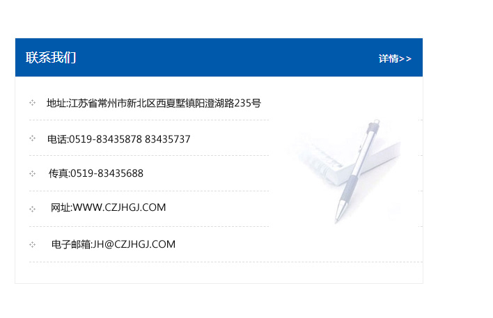 傳真:0519-83435688    郵編:213135    網址:WWW.czjhgj_com.yqsafe-ele.com    電子郵箱:JH@czjhgj_com.yqsafe-ele.com